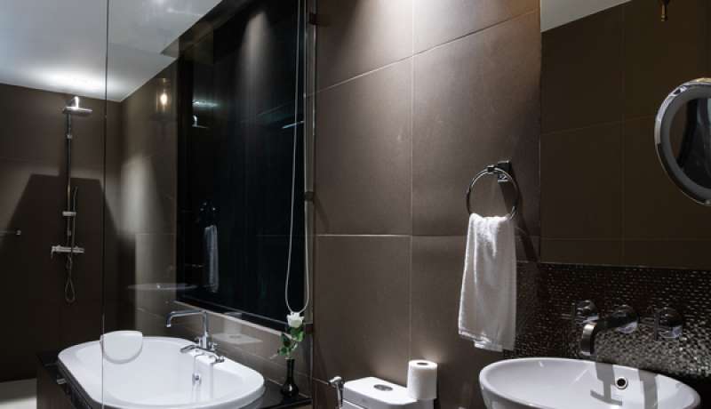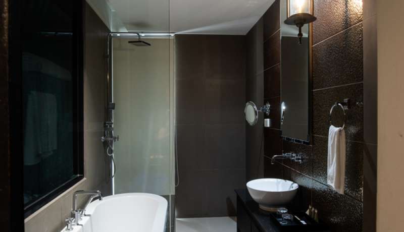 - Bathroom with rain shower, bathtub and hair dryer